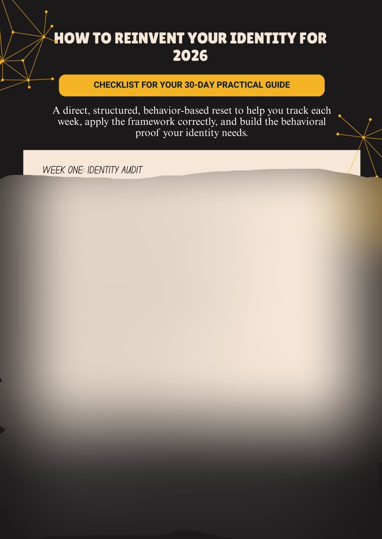 It gives you a clear, step-by-step structure to reset your identity over 30 days. No motivation. No vague advice. Just the exact actions required to stop reinforcing the old version of you and start building the one you actually need for 2026.